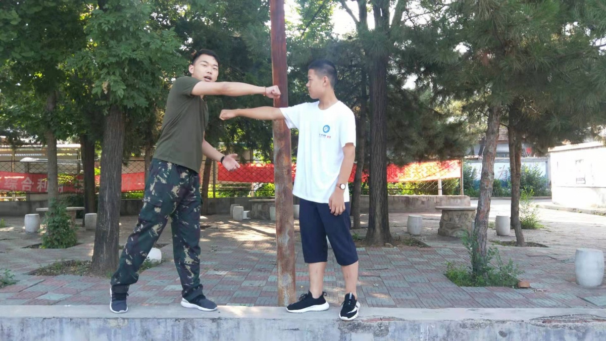 第一招:拨挡直拳。在我们学员的配合下,我们的教官给我们示范标准动作了。